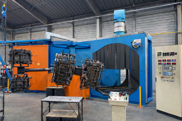 • Photo d’une machine de rotomoulage en production, avec les moules en rotation.